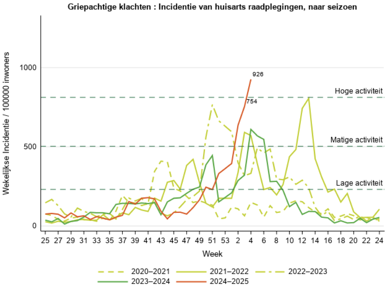 In week 4 van 2025 is de incidentie van huisartsconsultaties voor griepachtige klachten verder gestegen naar 926 raadplegingen per 100.000 inwoners. Dit cijfer ligt boven de drempel voor hoge activiteit en weerspiegelt een aanzienlijke belasting voor de eerstelijnszorg. De werkdruk voor huisartsen door consultaties voor luchtweginfecties werd door 74% van de peilhuisartsen als hoog of zeer hoog ervaren. Dat blijkt uit het Wekelijks bulletin acute luchtweginfecties van Sciensano.