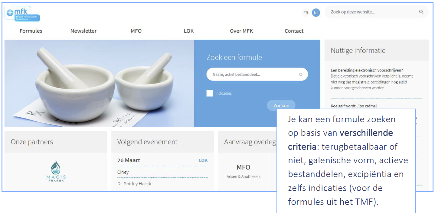De website www.mfk-qmp.be, referentiebron over de magistrale bereiding in ons land, heeft recent een grondige make-over ondergaan. De website oogt een stuk rustiger en is vooral veel gebruiksvriendelijker geworden. Je kan er voortaan formules zoeken op basis van verschillende criteria en je kan een aanvraag indienen om een LOK-vergadering te organiseren, maar ook een medisch-farmaceutisch overleg (MFO) met artsen en apothekers… Daarnaast is ook de rubriek ‘informatie’ opgewaardeerd.