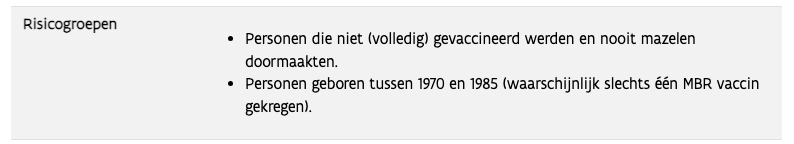 In de media werd de groep van personen geboren tussen 1970 en 1985 genoemd als een mogelijke doelgroep voor vaccinatie tegen mazelen. Deze groep is als 'risicogroep' terug te vinden in de samenvatting van de richtlijn door het Vlaamse departement Zorg .