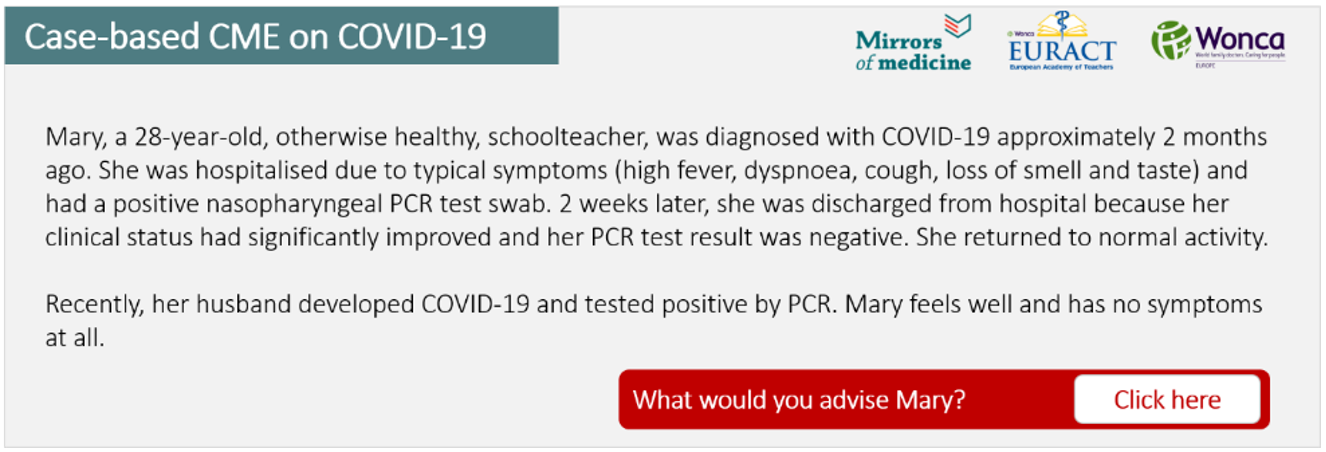 Het nieuwe e-learning programma over COVID-19 in de huisartspraktijk is ontwikkeld door een groep van 11 Europese huisarts-opleiders vanuit EURACT en WONCA in samenwerking met ISSECAM, een non-profit organisatie voor onafhankelijke CME. Het bevat een serie van 22 casussen over verschillende actuele vraagstukken rond het testen, de behandeling en de nazorg van patiënten met COVID-19.