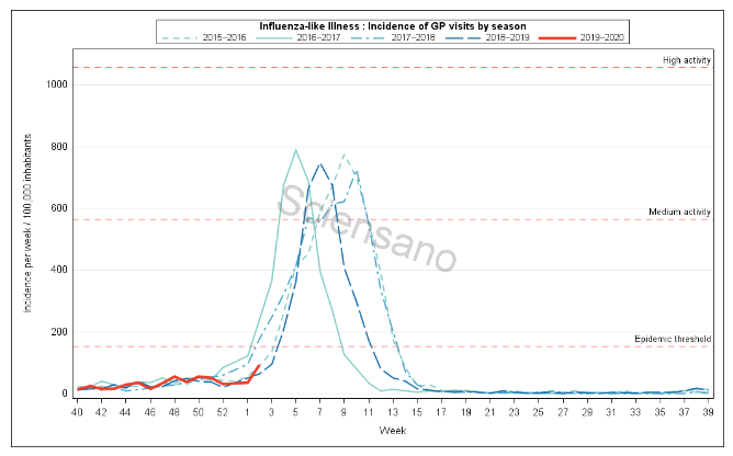 De incidentie van raadplegingen bij een huisarts met griepale aandoeningen steeg in de week van 6 tot 12 januari tot 94 per 100 000 inwoners. Dat ligt nog verder onder de epidemische drempel, maar toch wijst Sciensano erop dat het de eerste stap zou kunnen zijn naar een griepepidemie.