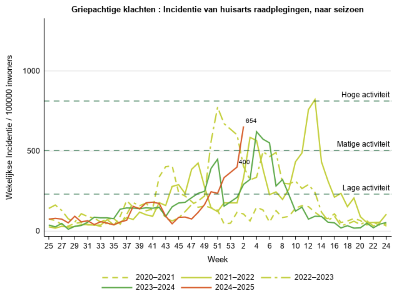 Uit het meest recente "wekelijks bulletin acute luchtweginfecties" van Sciensano van 15 januari blijkt dat in de tweede week van 2025 er een serieuze stijging zat in het aantal raadplegingen bij de huisarts voor griepachtige klachten. Daarbij werd de drempel van 'Matige activiteit' overschreden.
