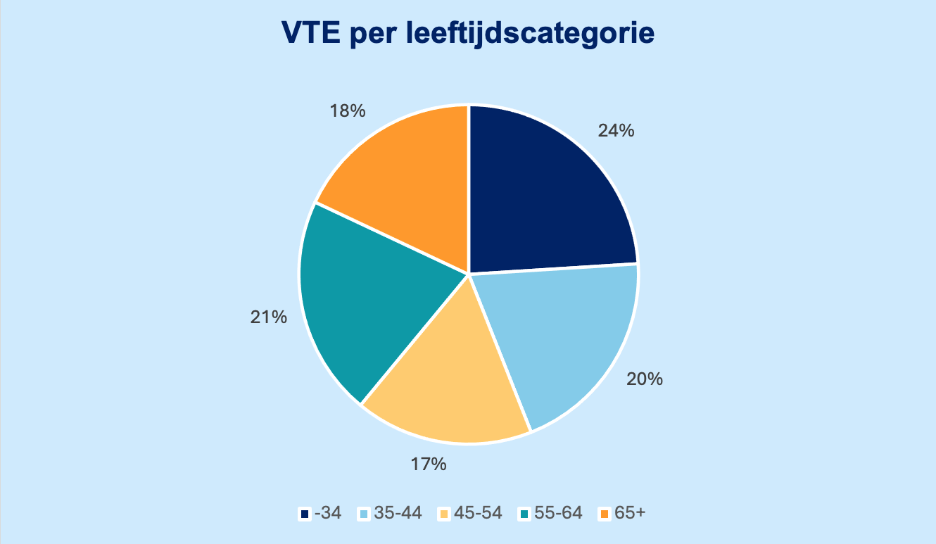 - 18% van de VTE is ouder dan 65 jaar, een stijging van ruim 80% ten opzichte van 2013