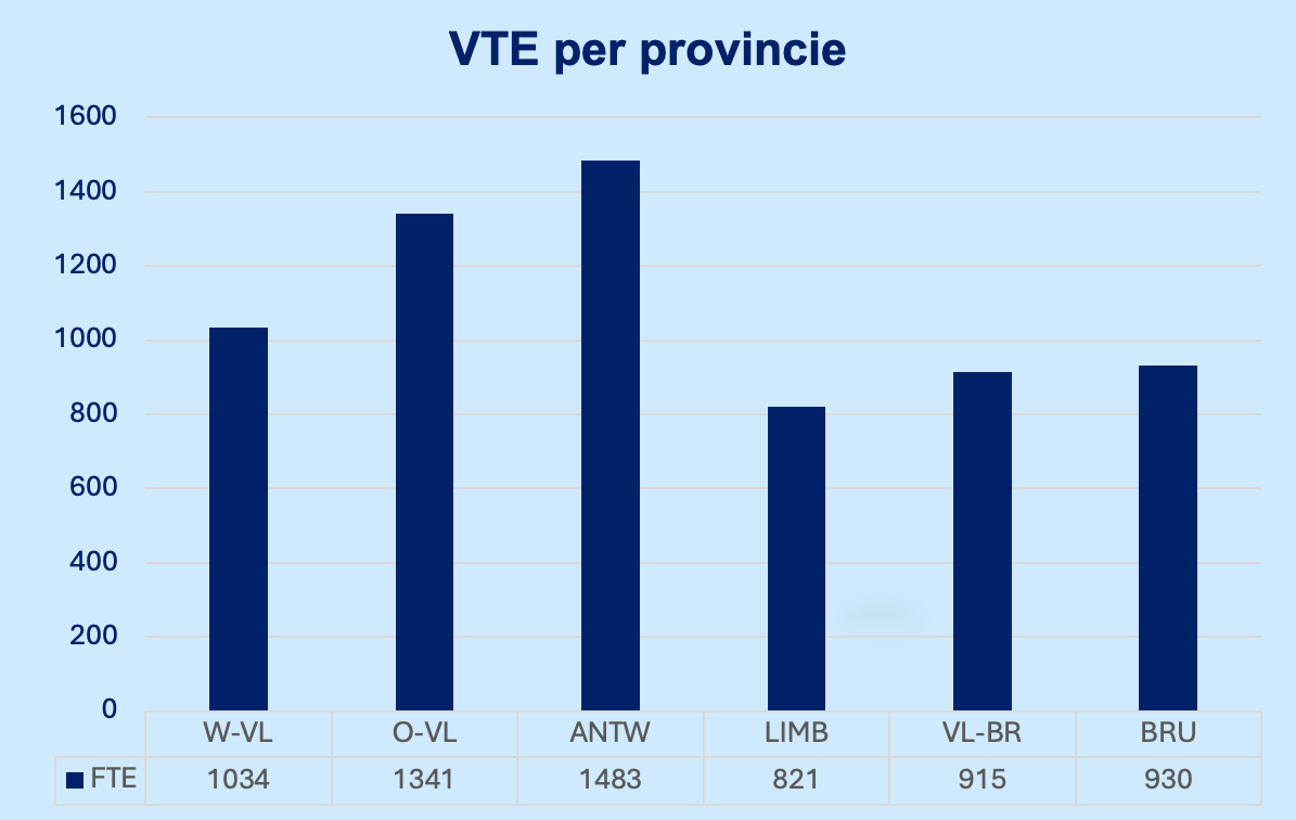 In Vlaanderen telt Antwerpen de meeste voltijdse equivalenten (1483 VTE), terwijl Limburg met 821 VTE een stuk lager scoort.