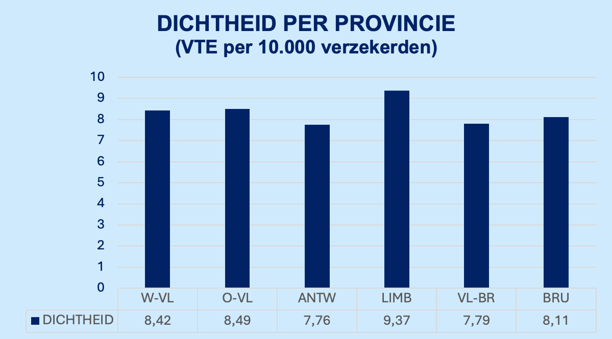 Om een realistischer beeld te schetsen, hebben de onderzoekers het aantal VTE per 10.000 verzekerden berekend. Hieruit blijkt dat deze in België is gestegen van 7,9 in 2013 naar 8,35 in 2023. Hierbij zien we opnieuw regionale verschillen (grafiek 2). Limburg telt het meeste voltijdse equivalenten per 10.000 verzekerden, terwijl Antwerpen nu lager scoort.