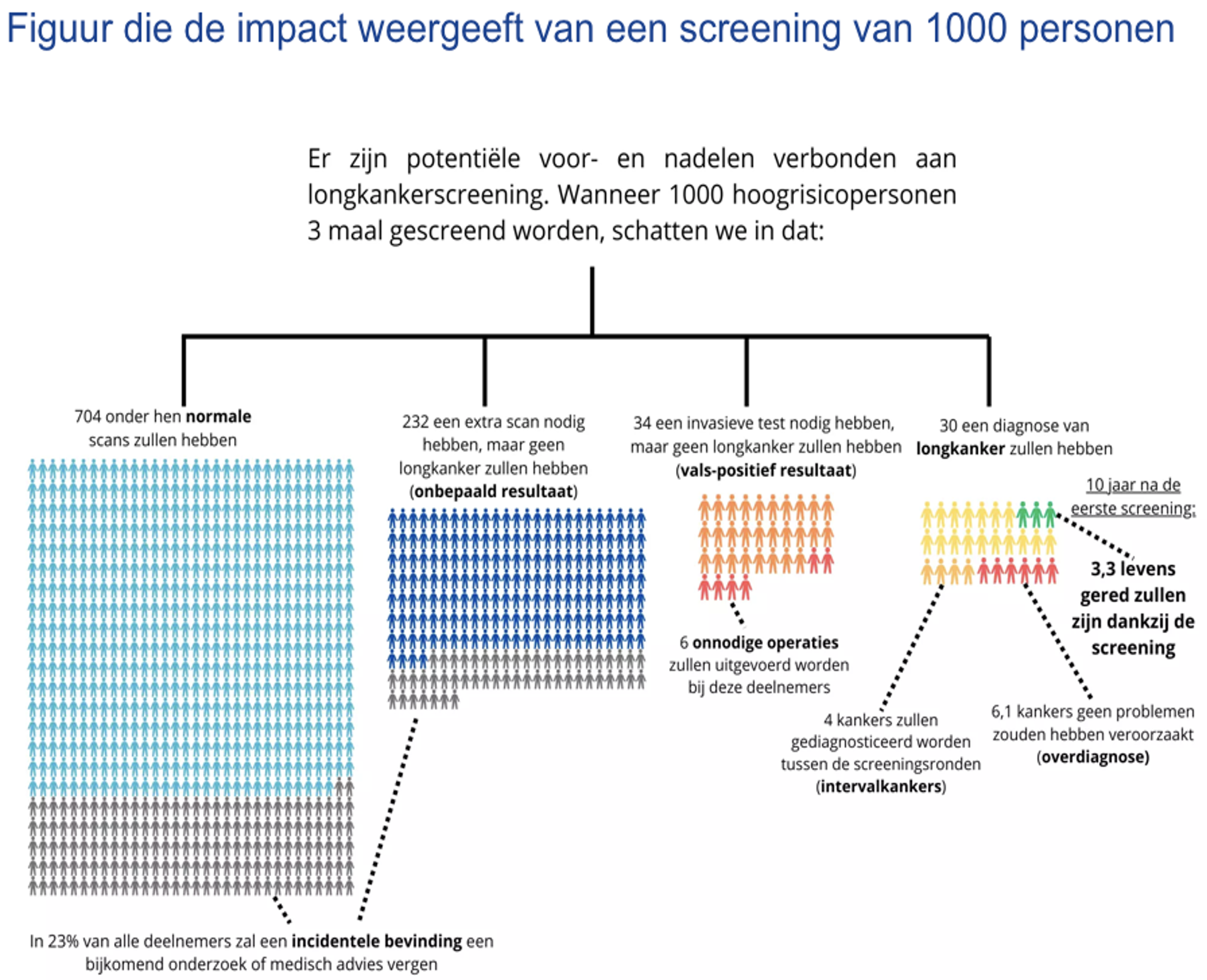 Even in perspectief. Om één overlijden ten gevolge van longkanker te voorkomen moeten 130 tot 250 (ex)-rokers herhaaldelijk gescreend worden. (3, 4) Deze uitgenodigde patiënten hebben vragen, twijfels, bedenkingen en voor 129 tot 249 van hen voegt dat niets toe aan hun gezondheid of levensverwachting; eerder het tegendeel: het oppoken van latente angsten. Bovendien is geen enkel screeningsinstrument (ook niet de CT-scan voor longkankeropsporing) 100% betrouwbaar. Er zijn vals-negatieve uitslagen en onterechte geruststelling. Daarnaast zijn er vals-positieve resultaten, met onnodige ongerustheid. (2) Ten slotte is er het fenomeen van overdiagnose, waarbij een ‘ziekte’ wordt vastgesteld die nooit tot symptomen of de dood zal leiden tijdens de verwachte levensduur van een patiënt. De laagdrempelige inzet van populatiescreening draagt bij aan overdiagnose. (5)