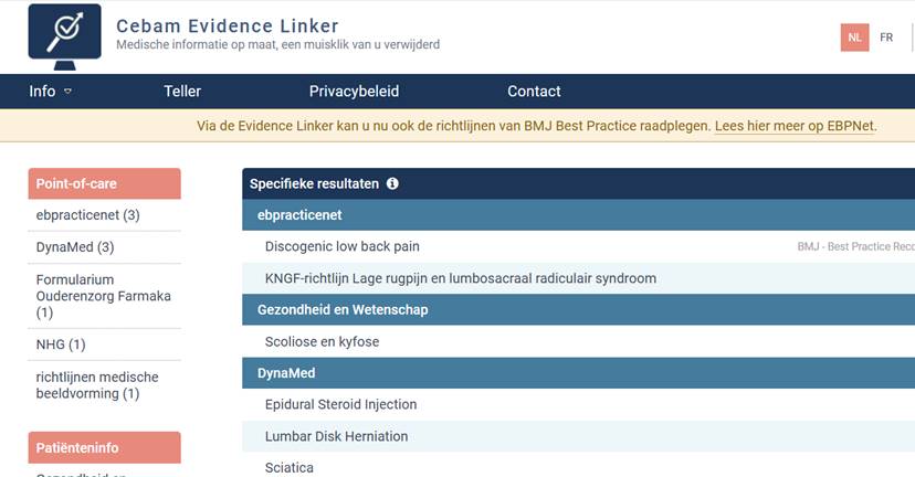 De Cebam Evidence Linker is gekoppeld aan de diagnose (gecodeerd in ICPC2/ICD10) en linkt naar relevante evidence-based informatie zoals ebpnet, BMJ best practices, Dynamed, etc.