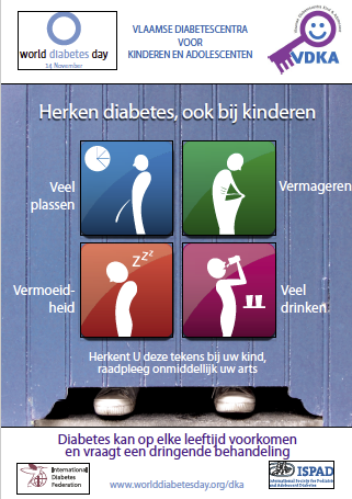 De diagnose van diabetes type 1 wordt op steeds jongere leeftijd gesteld en ook diabetes type 2 komt bij adolescenten vaker voor. Voor een snellere herkenning van de symptomen verspreiden de Vlaamse Diabetescentra voor Kinderen en Adolescenten (VDKA) een poster die u in uw wachtzaal kunt ophangen.