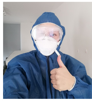 Een vriendelijke medewerker begeleidt me naar de kleedruimte waar ik in volgorde aantrek: een volledig beschermend pak maat XXL waarin ik zo'n beetje verzuip, schoenbeschermers, een bril, een mondmasker en handschoenen. Als laatste trek ik de capuchon van het pak over mijn hoofd en is er geen stukje huid meer bloot. Allemaal prima voorzorgsmaatregelen maar wel wat benauwend, zeker als blijkt dat de verwarming in het kabinet maximaal aanstaat: ik ben blij dat het geen zomer is! Al snel ontdek ik ook dat het heel onhandig is als je een snotneus hebt aangezien je je mondmasker niet kunt afzetten om je neus te snuiten en je bril continu beslaat. En dat voor vier uur lang...