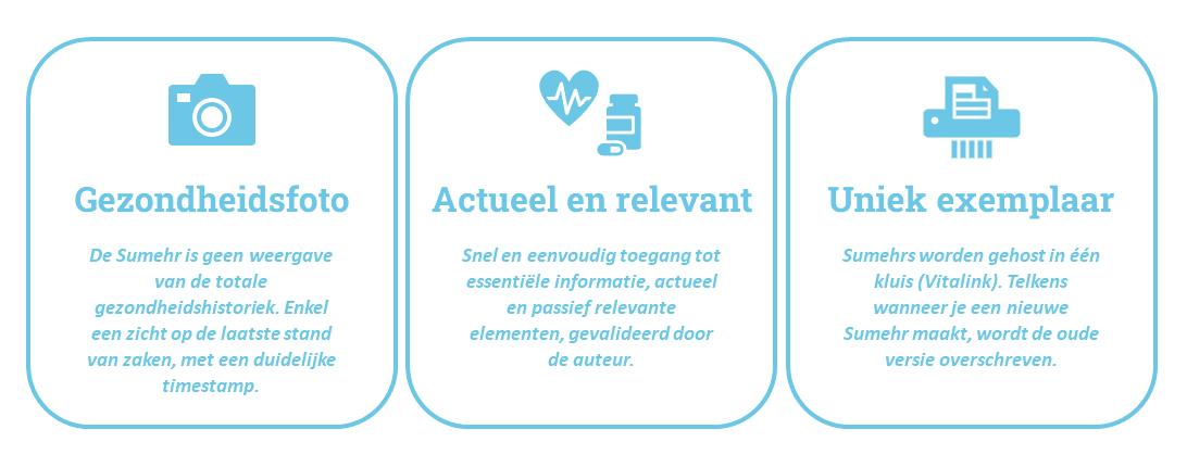 - De Sumehr dient up-to-date te zijn: iedere wijziging in de pertinente gezondheidsgegevens van een patiënt moet leiden tot een update van de Sumehr. Diegene die de Sumehr raadpleegt moet er zich echter bewust van zijn dat een vertraging kan optreden alvorens nieuwe gegevens geïntegreerd zijn.