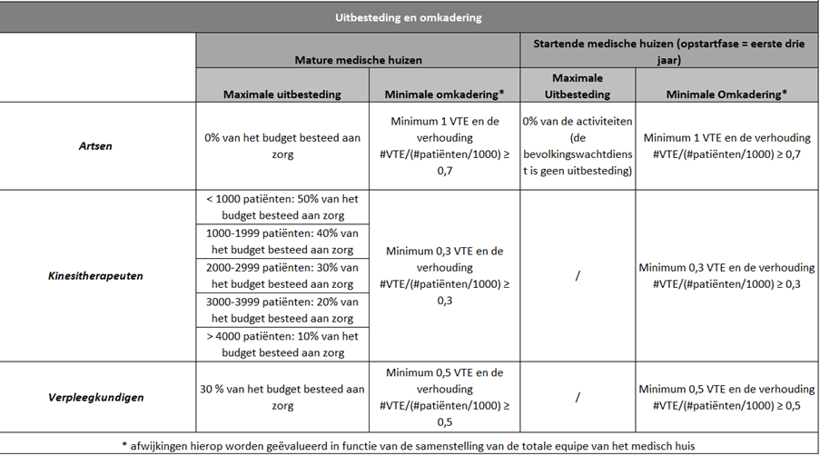 Voor de thuiszorg en kinesitherapie kan het medisch huis kiezen om dit deels uit te besteden aan externe thuisverpleegkundigen/kinesisten. Het RIZIV legt een minimumkadering van thuisverpleegkundige zorg op waarbij niet gekeken wordt naar de zorgnood.