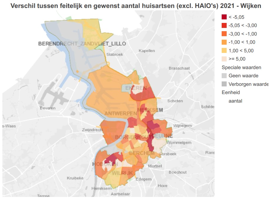 Deze figuur geeft een overzicht van de wijken in Antwerpen en het aantal gevestigde huisartsenpraktijken. Hoe donkerder het gebied, hoe groter het huisartsentekort in deze zone. Deze figuur is opgemaakt door de lokale huisartsenkringen: huisartsenkring Minerva, huisartsenkring Antwerpen-Oost, - Noord en – Zuid.