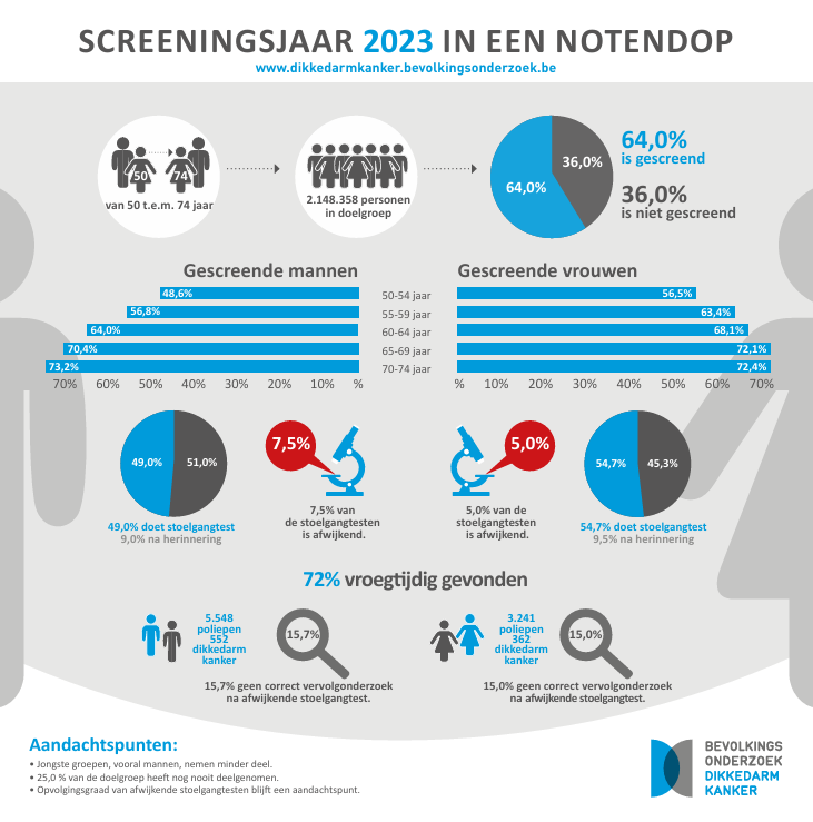 - Vlaams Agentschap Zorg en Gezondheid. (2023). Jaarfiche 2023: Bevolkingsonderzoek naar dikkedarmkanker. https://dikkedarmkanker.bevolkingsonderzoek.be/sites/default/files/2023-12/Jaarfiche%202023.pdf